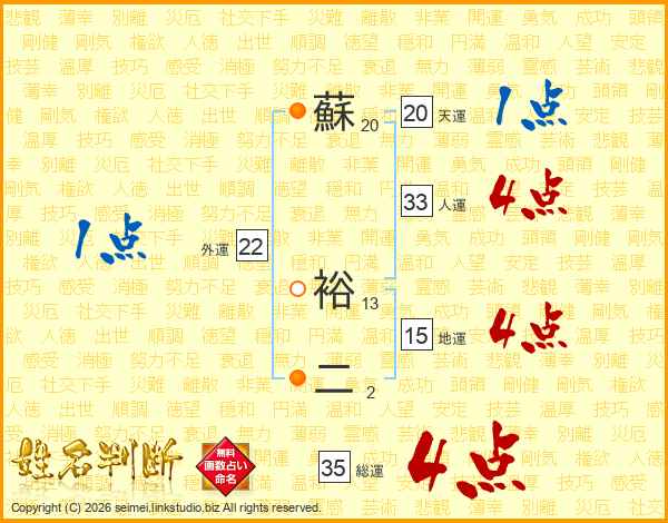 蘇裕二さんの人運は33画の4点!