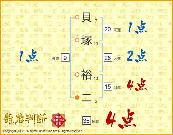 貝(7画)塚(13画) 裕(13画)二(2画)