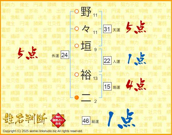 野(11画)々(11画)垣(9画) 裕(13画)二(2画)