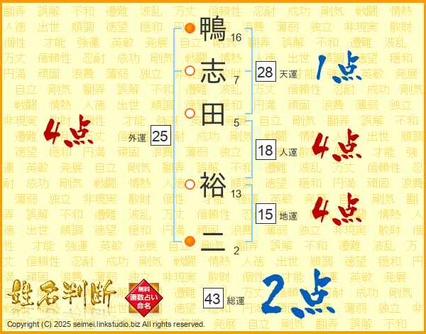 鴨(16画)志(7画)田(5画) 裕(13画)二(2画)