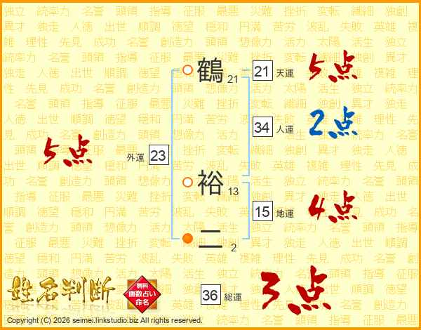 生活面を象徴する運勢です。外部から受ける影響力を表し、結婚運、家庭運や職場、環境への順応性を表します。総運から人運を引いた画数。姓や名が1文字の場合を除く。
