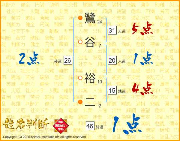 鷺(24画)谷(7画) 裕(13画)二(2画)