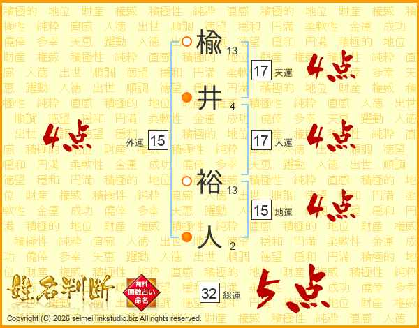 楡井裕人さんの総運は32画の5点!