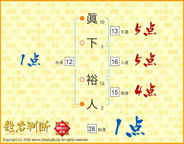 眞下裕人さんの総運は28画の1点!