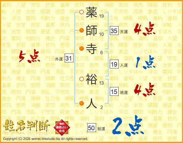 薬師寺裕人さんの総運は50画の2点!