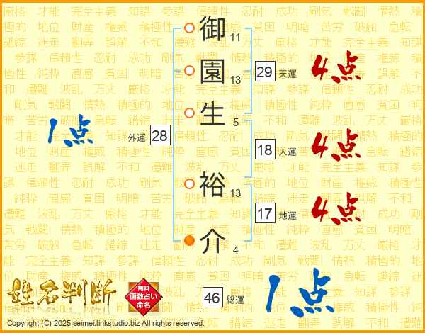 御(11画)園(13画)生(5画) 裕(13画)介(4画)