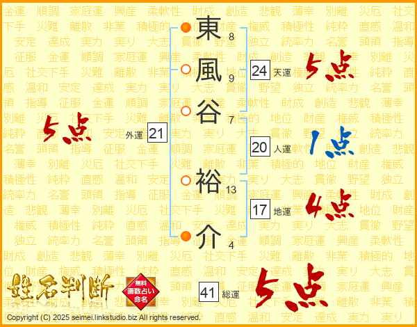 東(8画)風(9画)谷(7画) 裕(13画)介(4画)