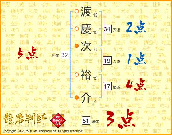 渡(13画)慶(15画)次(6画) 裕(13画)介(4画)