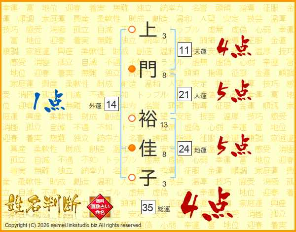 上(3画)門(8画) 裕(13画)佳(8画)子(3画)
