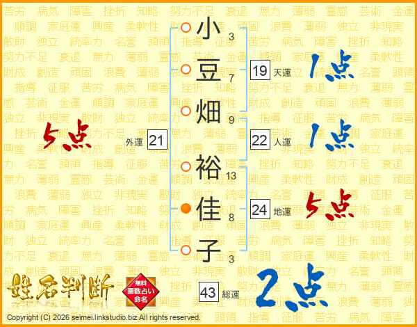 小(3画)豆(7画)畑(9画) 裕(13画)佳(8画)子(3画)
