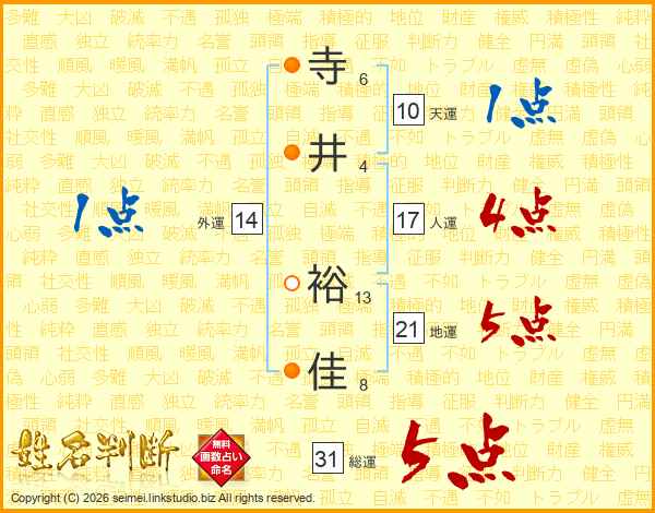 寺井裕佳さんの総運は31画の5点!