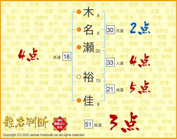 木(4画)名(6画)瀬(20画) 裕(13画)佳(8画)