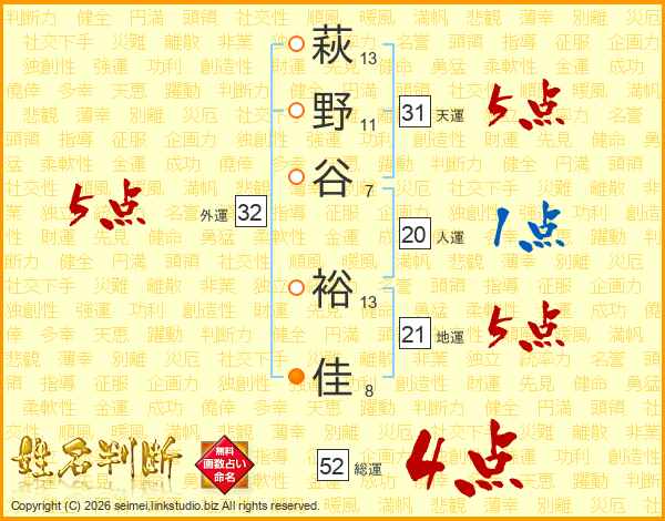 萩(13画)野(11画)谷(7画) 裕(13画)佳(8画)
