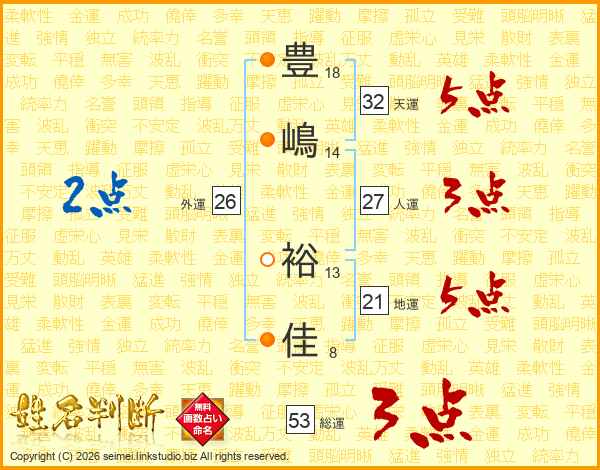 豊(18画)嶋(14画) 裕(13画)佳(8画)