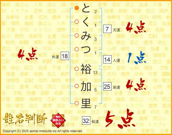 と(2画)く(1画)み(3画)つ(1画) 裕(13画)加(5画)里(7画)