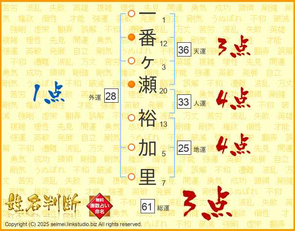 一番ヶ瀬裕加里さんの人運は33画の4点!