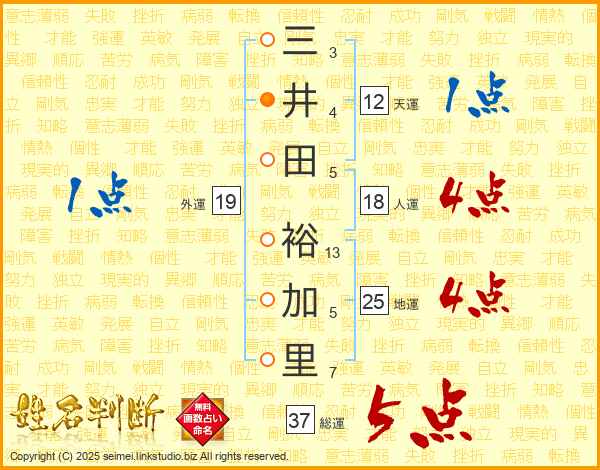 三(3画)井(4画)田(5画) 裕(13画)加(5画)里(7画)