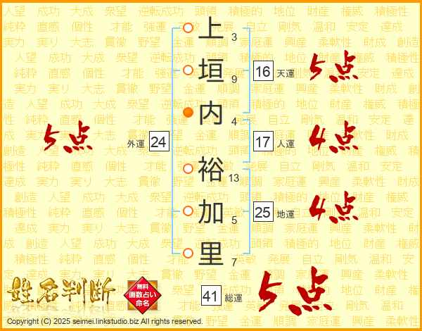 上(3画)垣(9画)内(4画) 裕(13画)加(5画)里(7画)