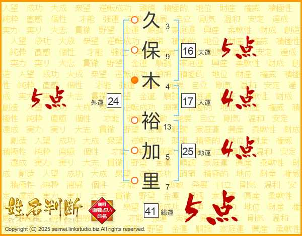 久(3画)保(9画)木(4画) 裕(13画)加(5画)里(7画)