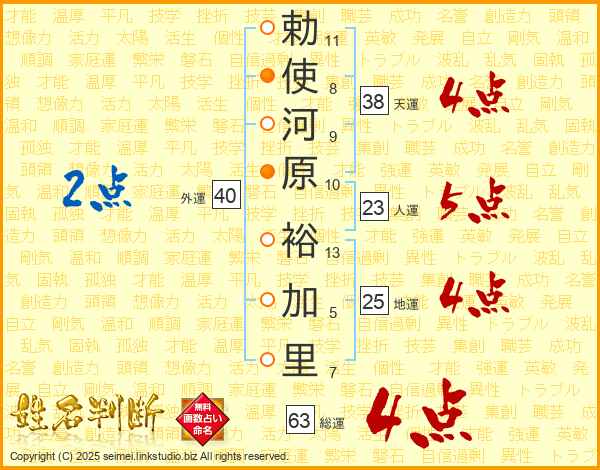勅(11画)使(8画)河(9画)原(10画) 裕(13画)加(5画)里(7画)