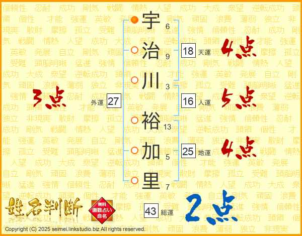 宇(6画)治(9画)川(3画) 裕(13画)加(5画)里(7画)