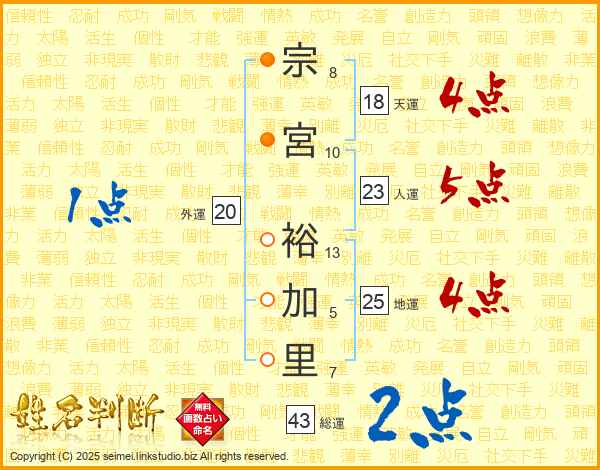 宗(8画)宮(10画) 裕(13画)加(5画)里(7画)