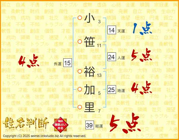 小笹裕加里さんの総運は39画の5点!