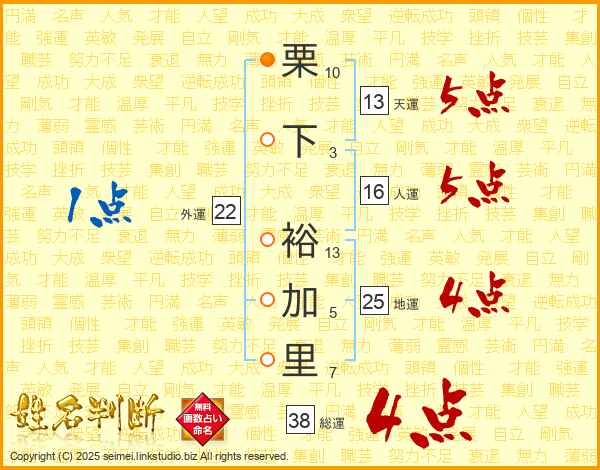 栗(10画)下(3画) 裕(13画)加(5画)里(7画)