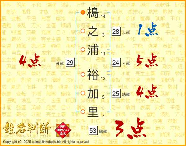 槝(14画)之(3画)浦(11画) 裕(13画)加(5画)里(7画)