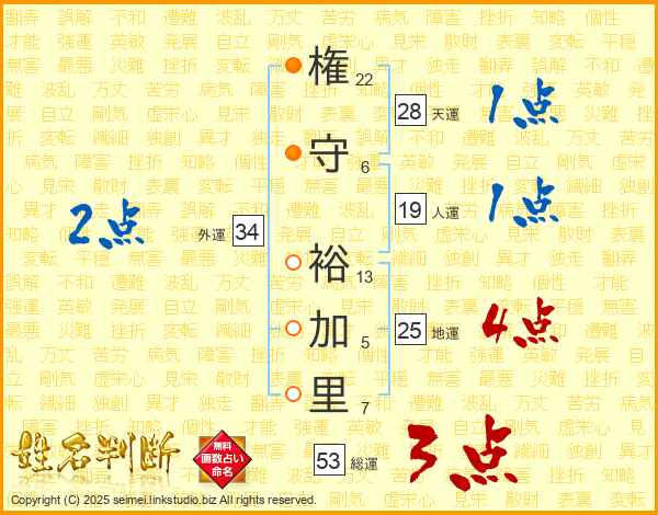 権(22画)守(6画) 裕(13画)加(5画)里(7画)