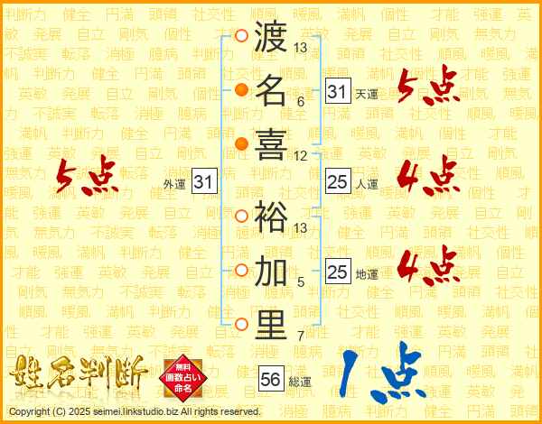 渡(13画)名(6画)喜(12画) 裕(13画)加(5画)里(7画)