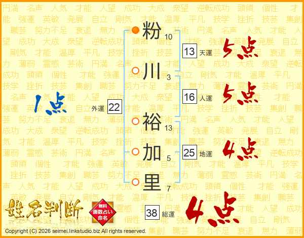 粉(10画)川(3画) 裕(13画)加(5画)里(7画)