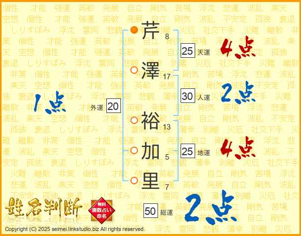 芹澤裕加里さんの天運は25画の4点!