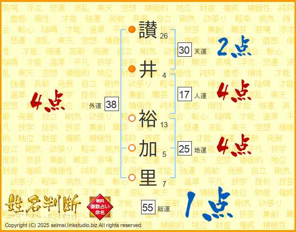 讃(26画)井(4画) 裕(13画)加(5画)里(7画)