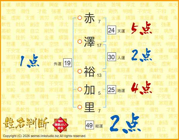 赤澤裕加里さんの天運は24画の5点!