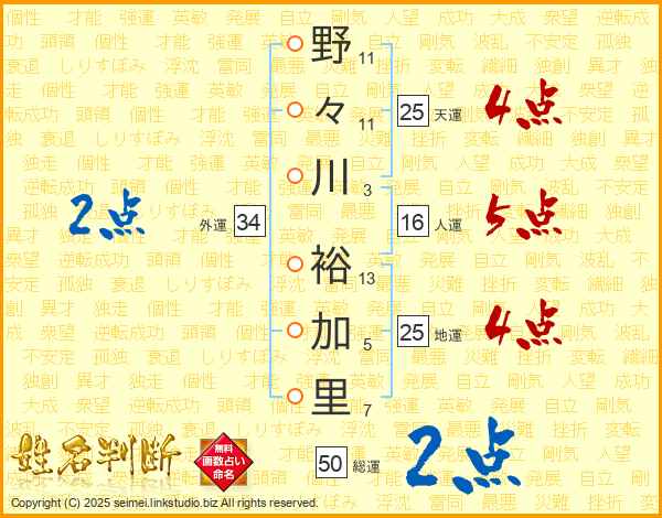 生活面を象徴する運勢です。外部から受ける影響力を表し、結婚運、家庭運や職場、環境への順応性を表します。総運から人運を引いた画数。姓や名が1文字の場合を除く。