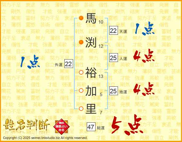 馬(10画)渕(12画) 裕(13画)加(5画)里(7画)