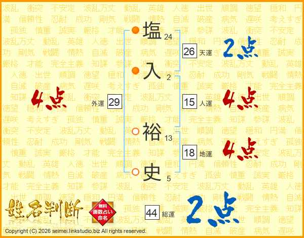 塩(24画)入(2画) 裕(13画)史(5画)