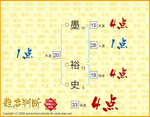 あなたの人生を表す1番重要な運勢です。生涯を通じて影響する総合運となり、主に50歳以降の晩年期に影響を及ぼします。苗字と名前の合計画数。