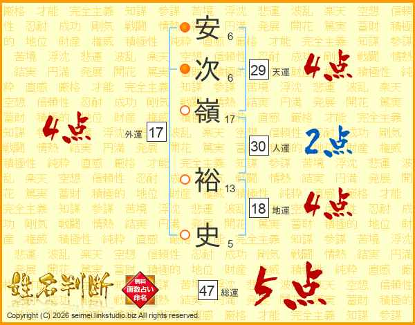 安(6画)次(6画)嶺(17画) 裕(13画)史(5画)