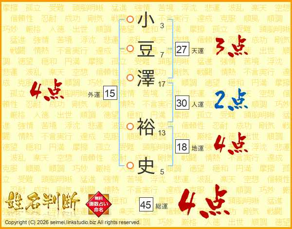 小豆澤裕史さんの総運は45画の4点!