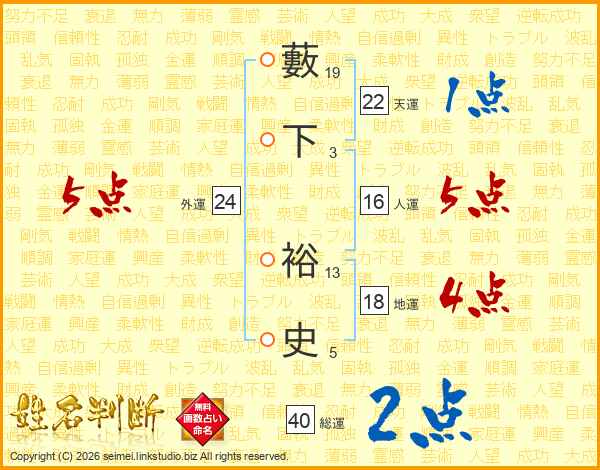 あなたの人生を表す1番重要な運勢です。生涯を通じて影響する総合運となり、主に50歳以降の晩年期に影響を及ぼします。苗字と名前の合計画数。