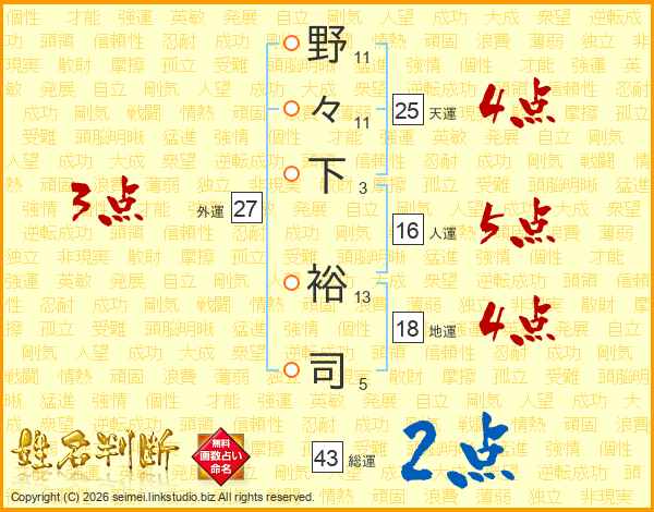 野々下裕司さんの総運は43画の2点!