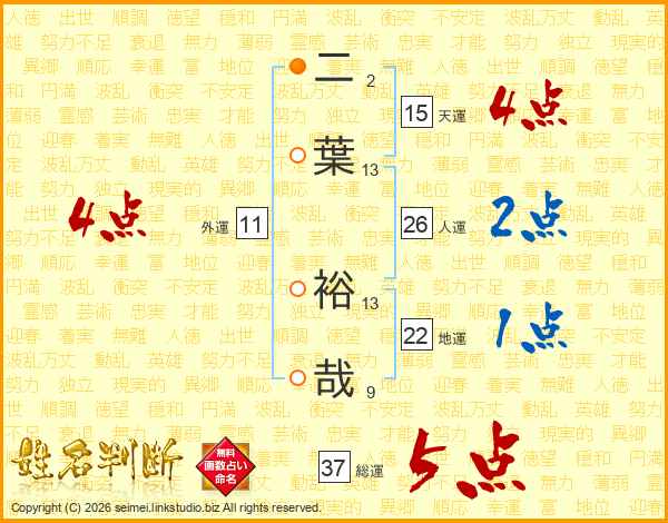 二(2画)葉(13画) 裕(13画)哉(9画)