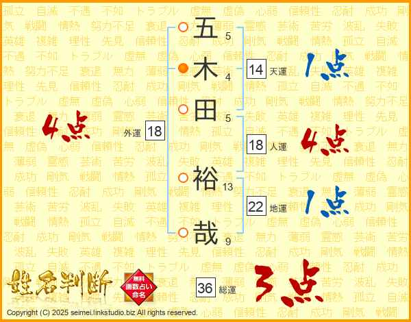 五(5画)木(4画)田(5画) 裕(13画)哉(9画)