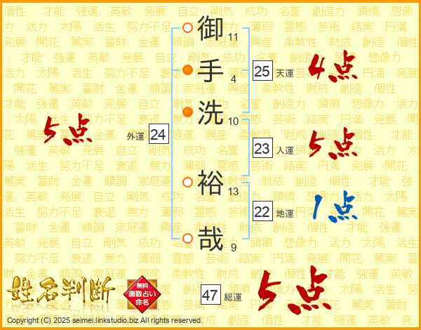御(11画)手(4画)洗(10画) 裕(13画)哉(9画)
