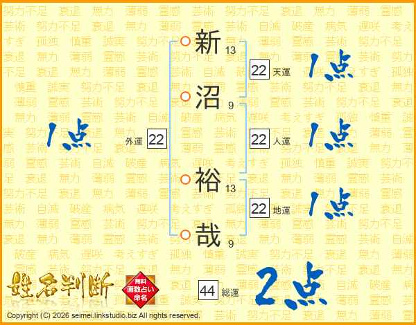 新沼裕哉さんの総運は44画の2点!