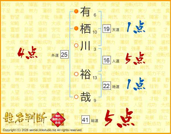 有栖川裕哉さんの総運は41画の5点!