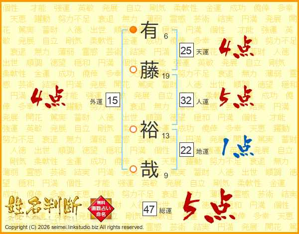 有藤裕哉さんの総運は47画の5点!