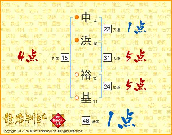 あなたの人生を表す1番重要な運勢です。生涯を通じて影響する総合運となり、主に50歳以降の晩年期に影響を及ぼします。苗字と名前の合計画数。